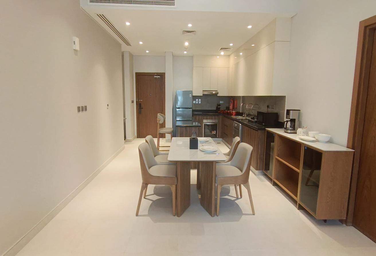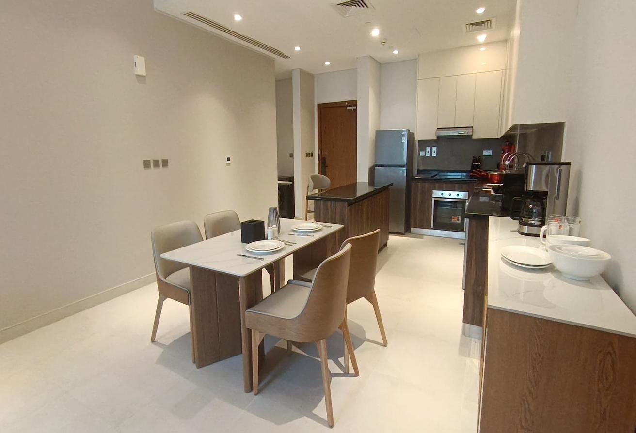 The apartment features a spacious bedroom, an open kitchen fully equipped with high-end appliances, 2 bathrooms, and a private balcony.