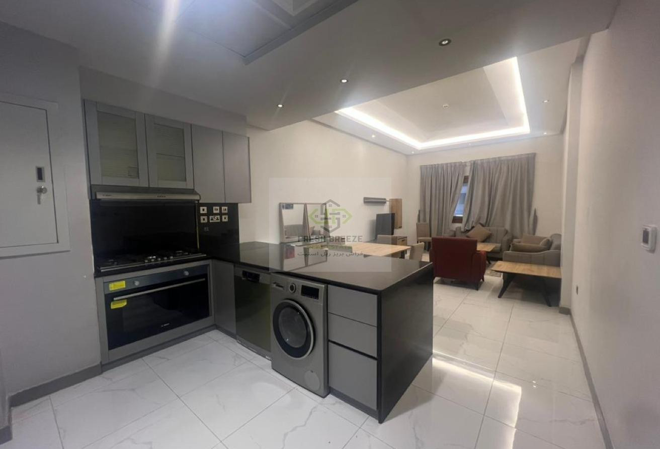 The apartment features a fully equipped closed-type kitchen with appliances, built-in wardrobes, and an open-plan living area. Enjoy the fresh air from your balconies in both the living room and bedroom, creating an atmosphere of refined elegance.