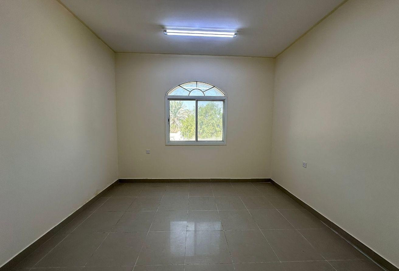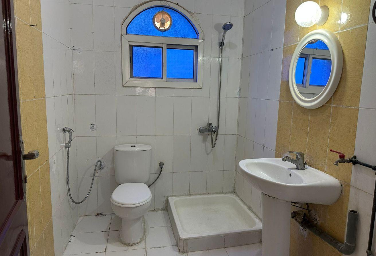 One-bedroom apartment (two bedrooms with a hallway) or one-bedroom apartment with a living room, separate kitchen, and bathroom, on the ground floor, facing the street, including split AC units, in Al Kharaitiyat, inside a villa, 3200.