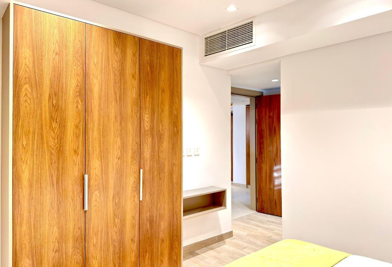The apartment is tastefully furnished with modern, high-quality furniture, creating a welcoming and comfortable atmosphere. The spacious bedroom features a comfortable bed, wardrobe, and elegant décor that ensures privacy and restful living. With two well-appointed bathrooms, the apartment offers added convenience for both residents and guests.