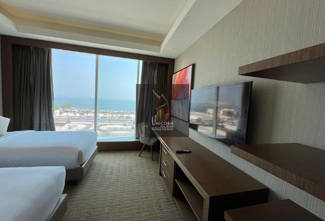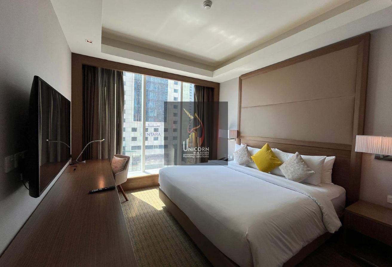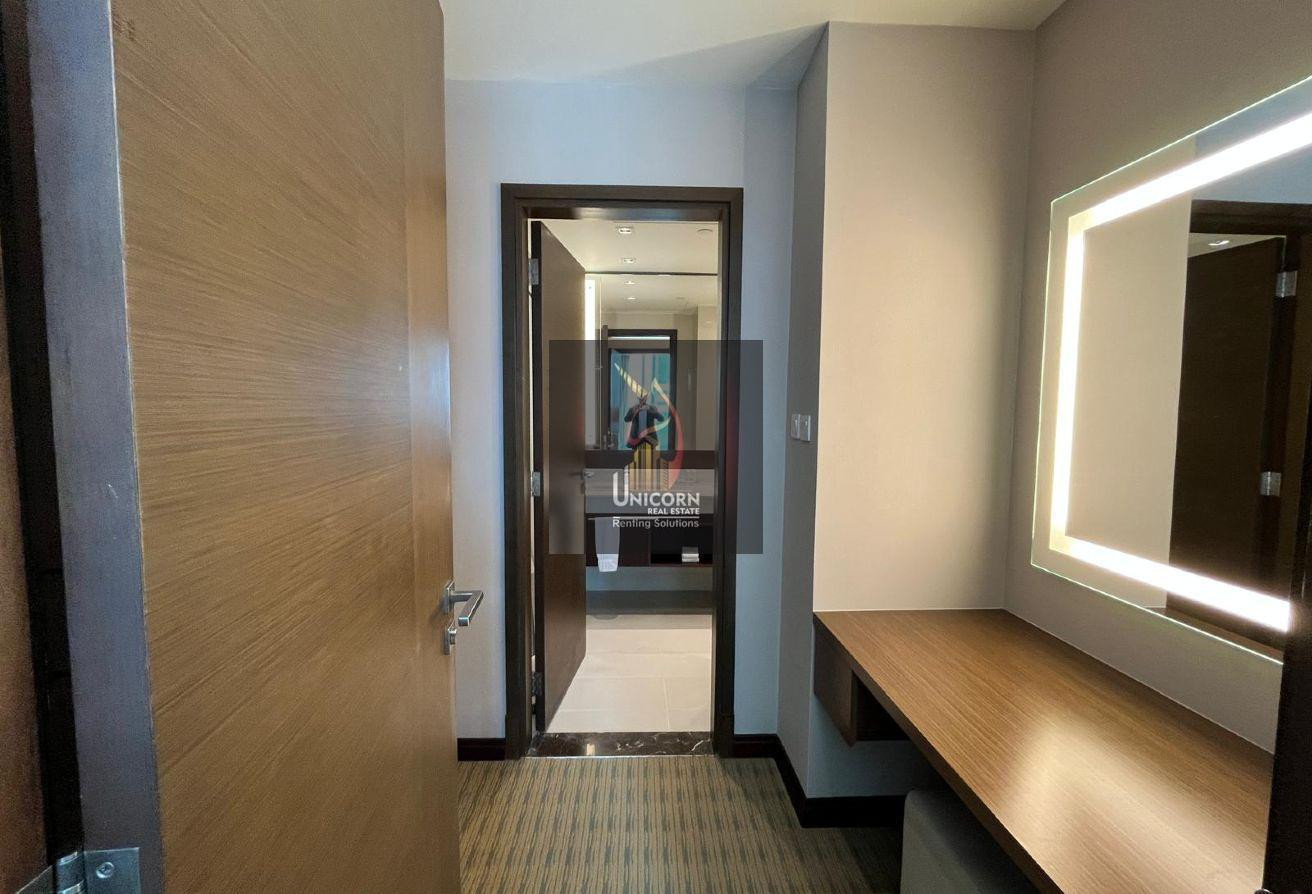 It boasts modern furniture, a spacious living and dining area, and open kitchen. It features a generously sized bedroom with built-in wardrobes and large windows, ensuring ample natural light and stunning views. As a hotel apartment, you can expect top-notch service and amenities.