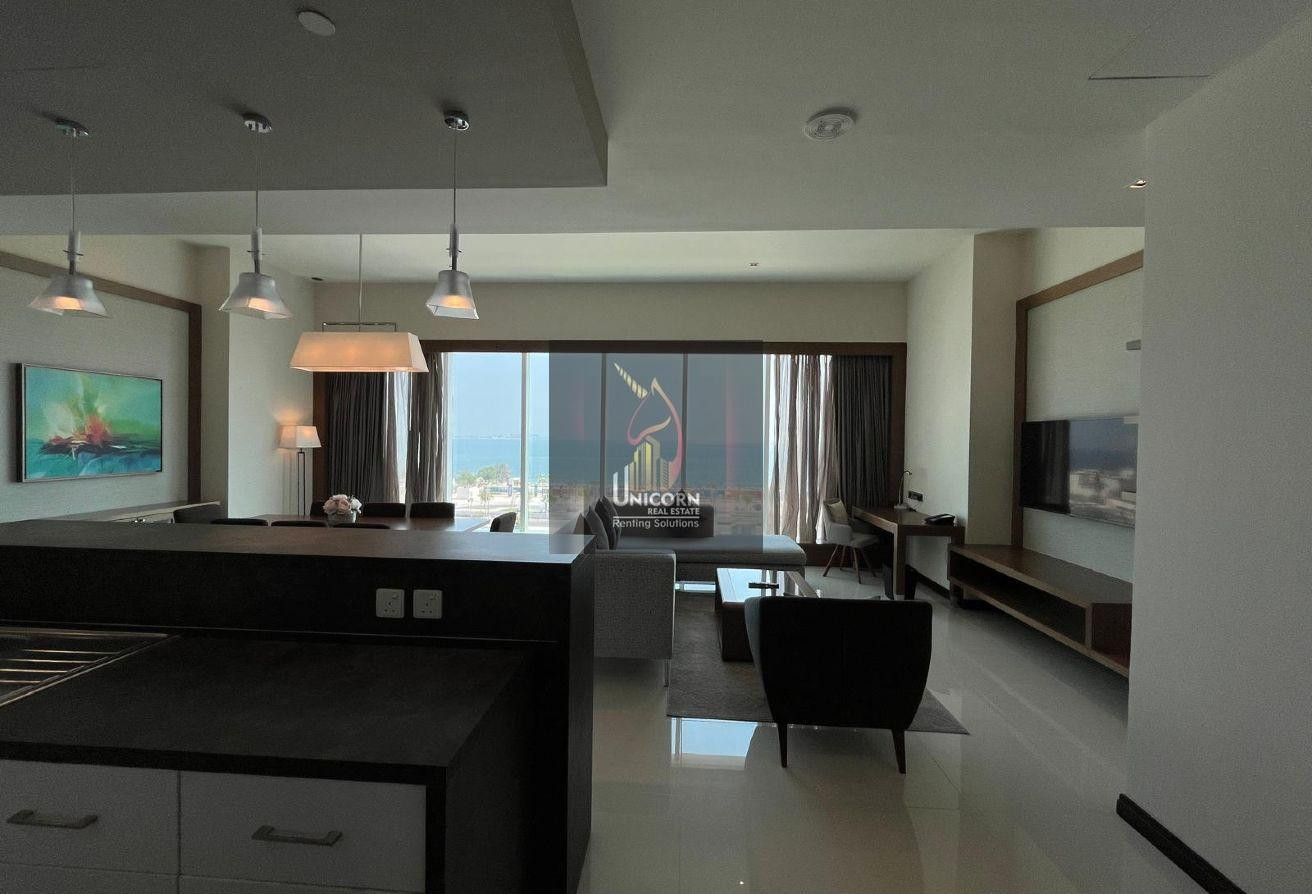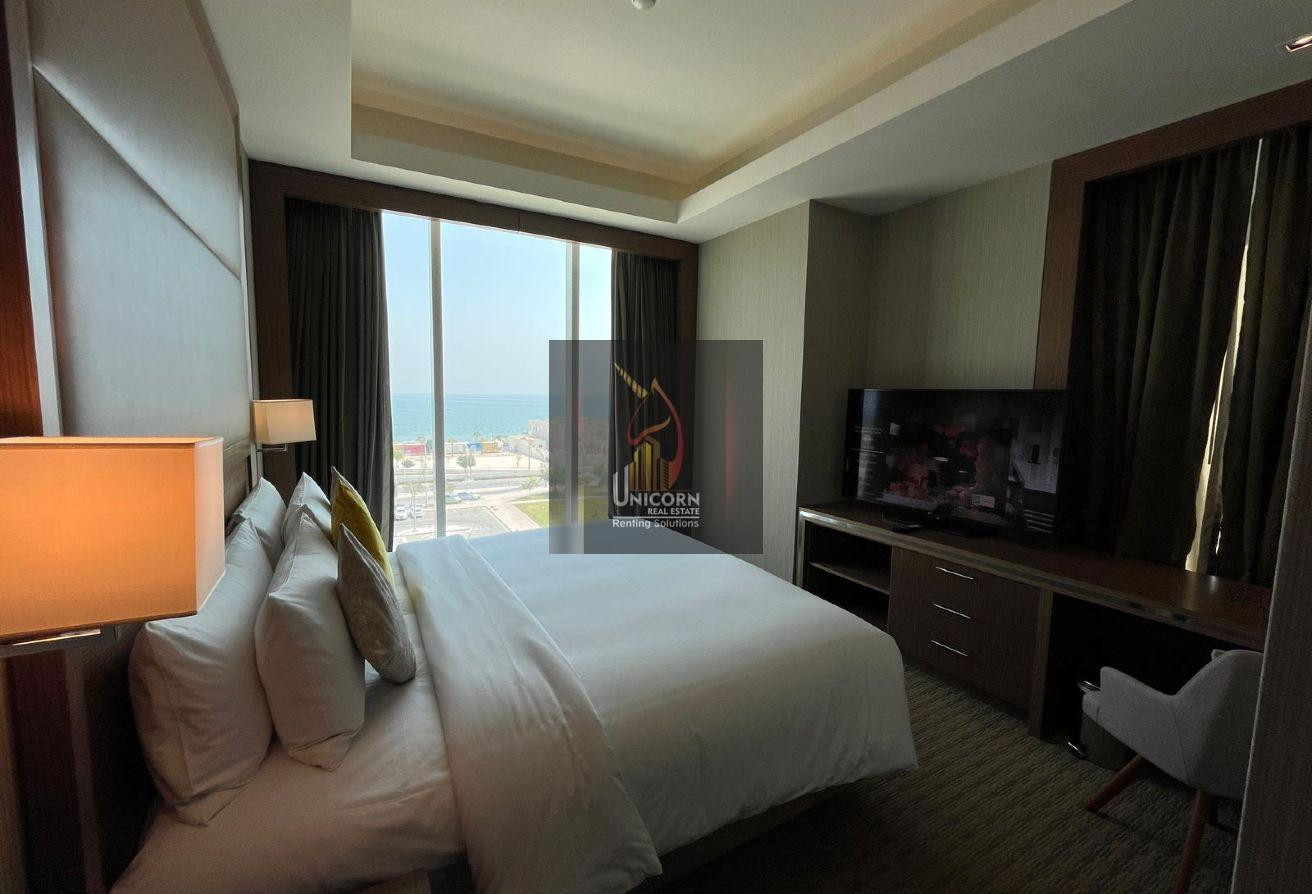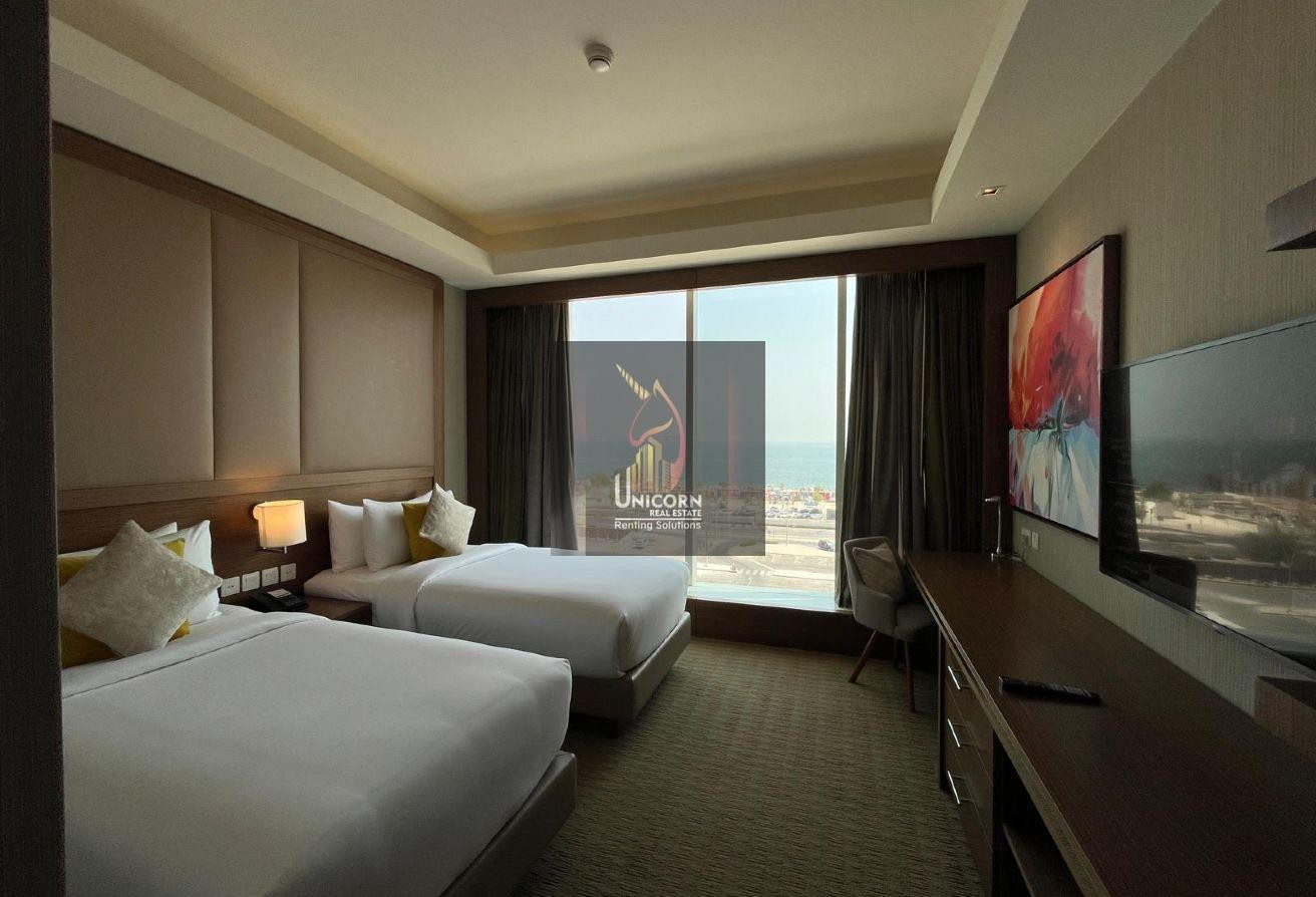 It boasts modern furniture, a spacious living and dining area, and open kitchen. It features a generously sized bedroom with built-in wardrobes and large windows, ensuring ample natural light and stunning views. As a hotel apartment, you can expect top-notch service and amenities.