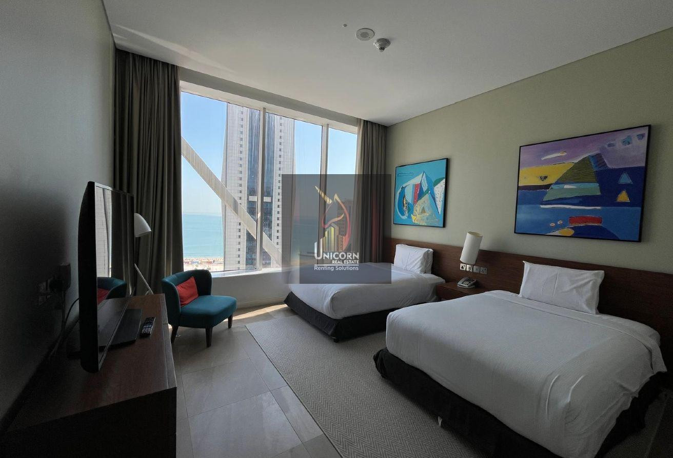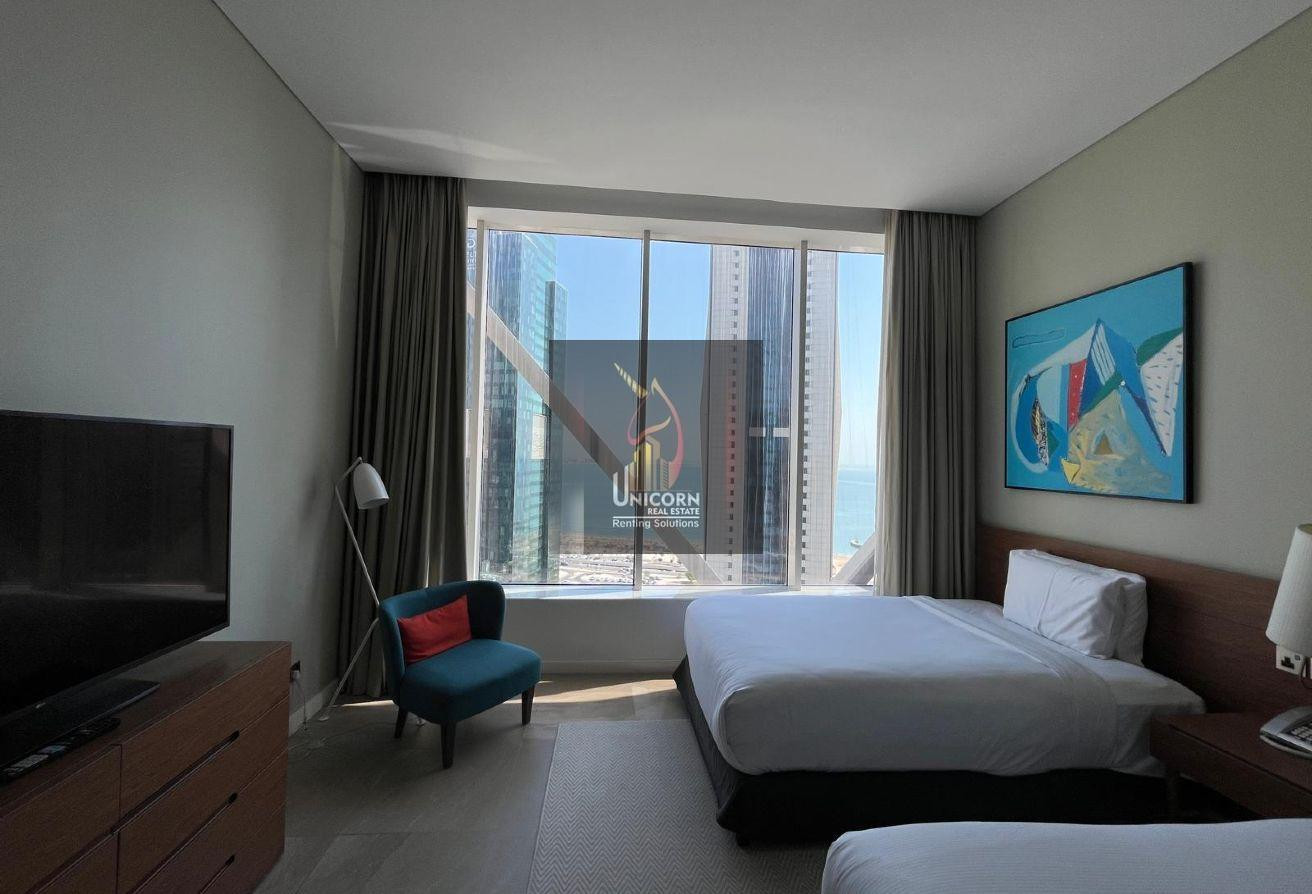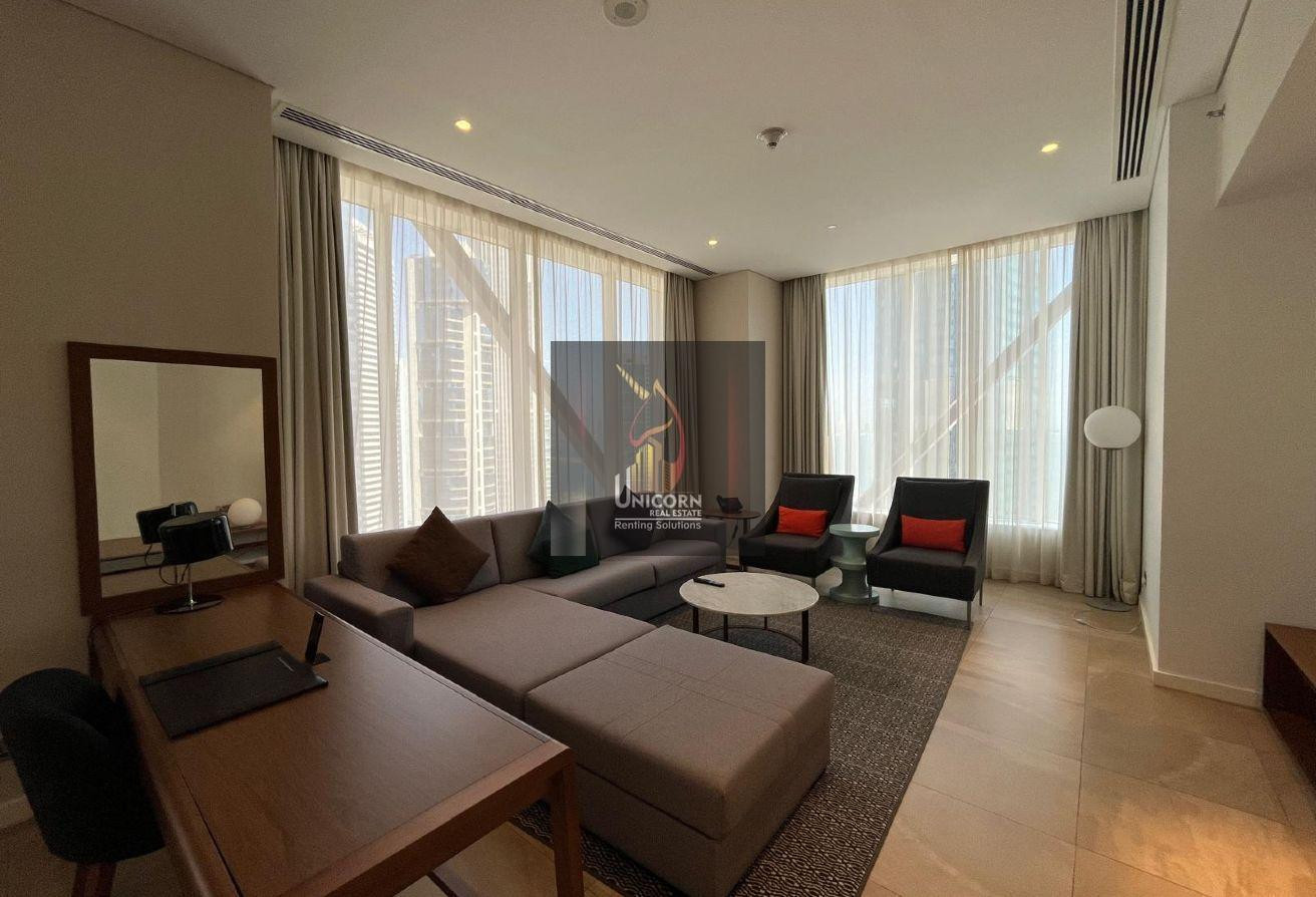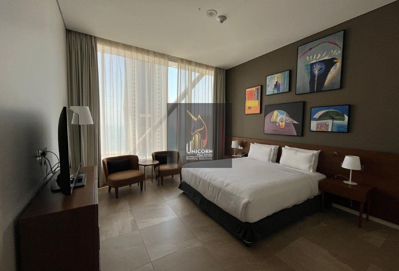 It boasts modern furniture, a spacious living and dining area, and open kitchen. It features a generously sized bedroom with built-in wardrobes and large windows, ensuring ample natural light and stunning views. As a hotel apartment, you can expect top-notch service and amenities.