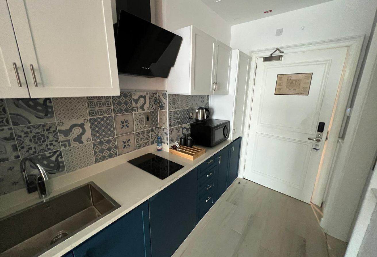 The apartment has natural light, creating a warm and inviting atmosphere perfect for relaxation or entertaining guests.