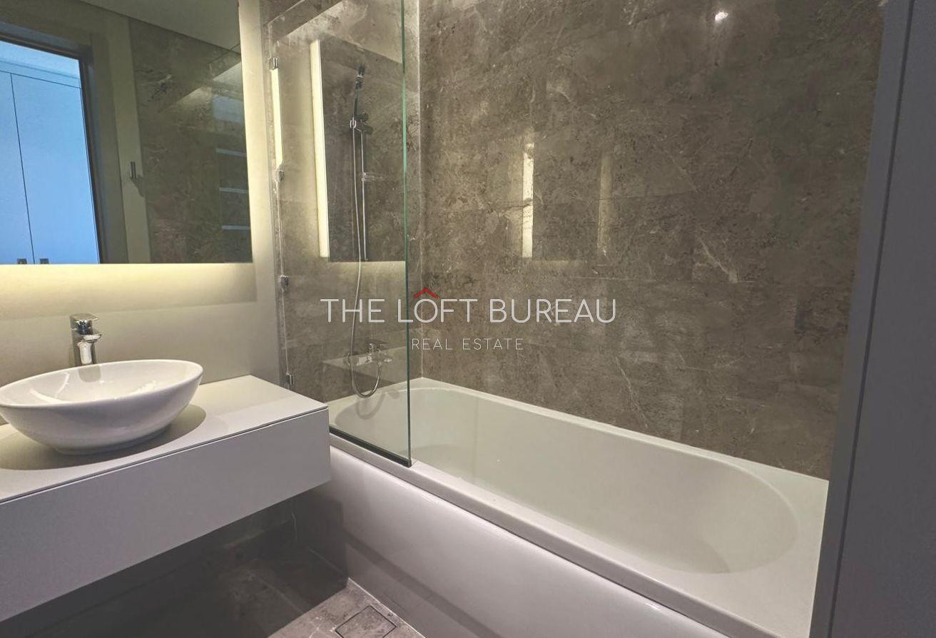 - The bathroom is tastefully designed with a freestanding bathtub, a glass-enclosed rain shower, and double vanity sinks — all finished in luxurious marble.