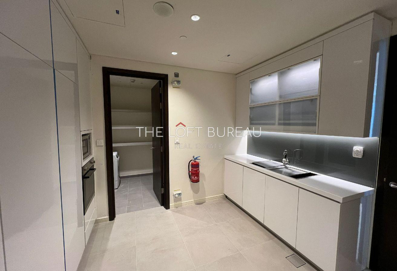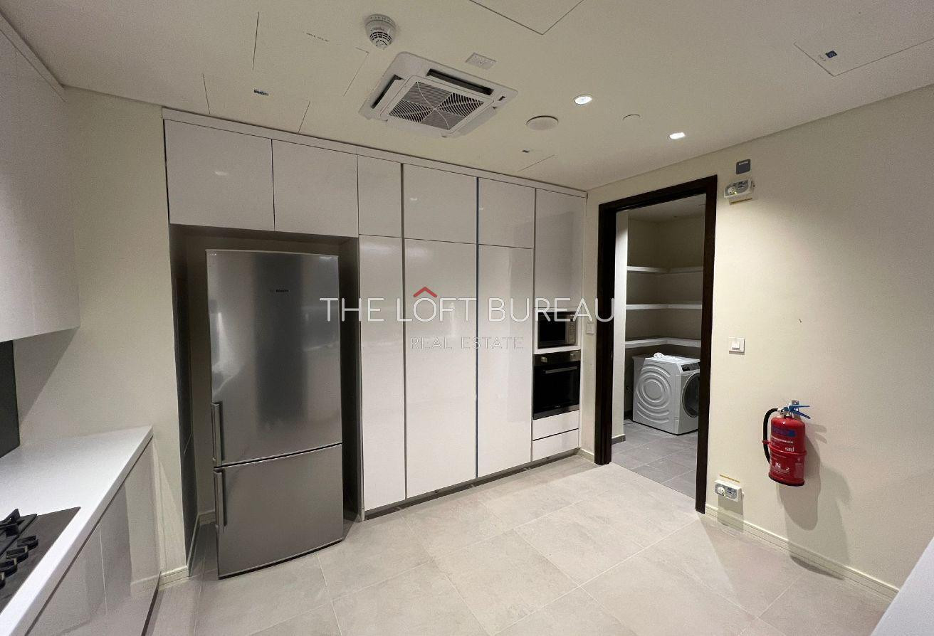 Fully fitted kitchen with built-in Bosch appliances, sleek cabinetry, and an adjoining laundry/storage area.